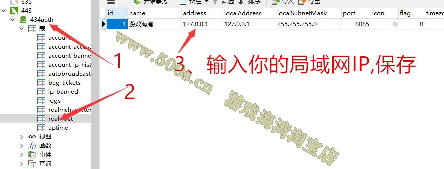 连接数据库后,找到realmlist表,双击左边的栏打开,双击realmist表,修改右边的realmist表,在address栏里粘帖您的IP地址